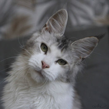 Son papa est Rocky Racoon Nobabyglare, un mâle extraordinaire black silver ticked tabby et blanc, et sa maman est Tatushka Nobabyglare PP, et est polydactyle et bleue silver blotched tabby et blanc.
